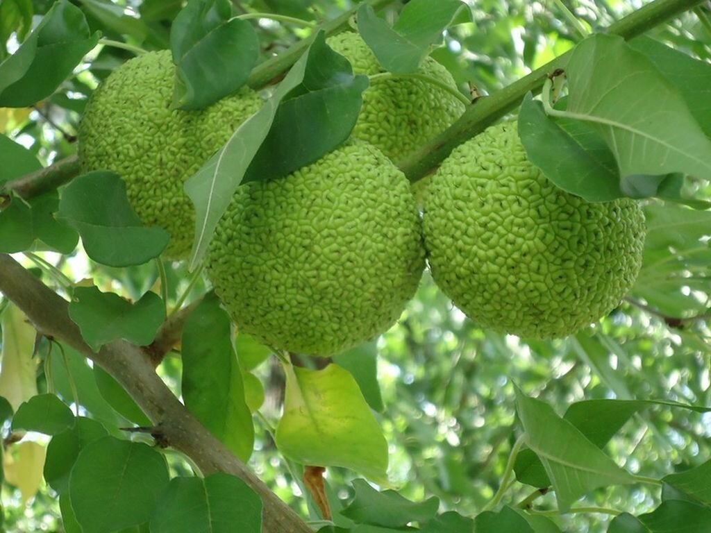 - Плоды: Маклюра известна своими необычными плодами, которые напоминают зеленые апельсины. Плоды не съедобны, но часто используются в народной медицине.